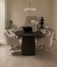 NOIR — це сучасний обідній стіл із чіткою архітектурною геометрією та відчуттям монументальності. Глибокий відтінок деревини контрастує з м’якими тактильними поверхнями інтер’єру та формує вишуканий акцент у просторі.Модель розроблена для інтер’єрів у стилі італійського сучасного мінімалізму: чисті лінії, матові поверхні, натуральні матеріали. Це предмет, який не просто виконує функцію, а задає характер усьому приміщенню. NOIR легко інтегрується у простір кухні-вітальні, приватного будинку або апартаментів бізнес-класу.